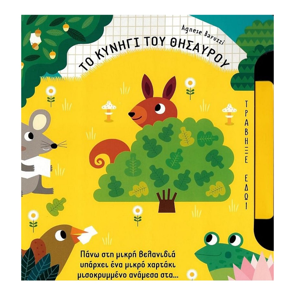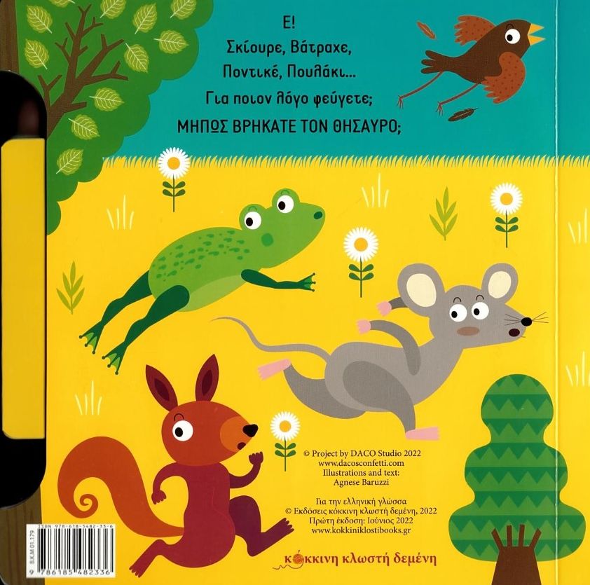 (από το βιβλίο) Ο σκίουρος, ο βάτραχος, το ποντίκι και το μικρό πουλί ψάχνουν να βρουν έναν πολύτιμο θησαυρό. Πρώτα όμως πρέπει να βρουν τέσσερα σημειώματα κρυμμένα στο περιβάλλον γύρω τους. Μόνο ενώνοντας τις δυνάμεις τους θα καταφέρουν να πετύχουν τον στόχο τους, γιατί ο καθένας τους είναι πολύτιμος για την επιτυχία του αυτού του διασκεδαστικού κυνηγιού θησαυρού. Χρησιμοποιήστε τα πτερύγια ώθησης και έλξης για να τα βοηθήσετε να ξεκινήσουν την δράση. Θα είναι όμως και ο θησαυρός πολύτιμος;