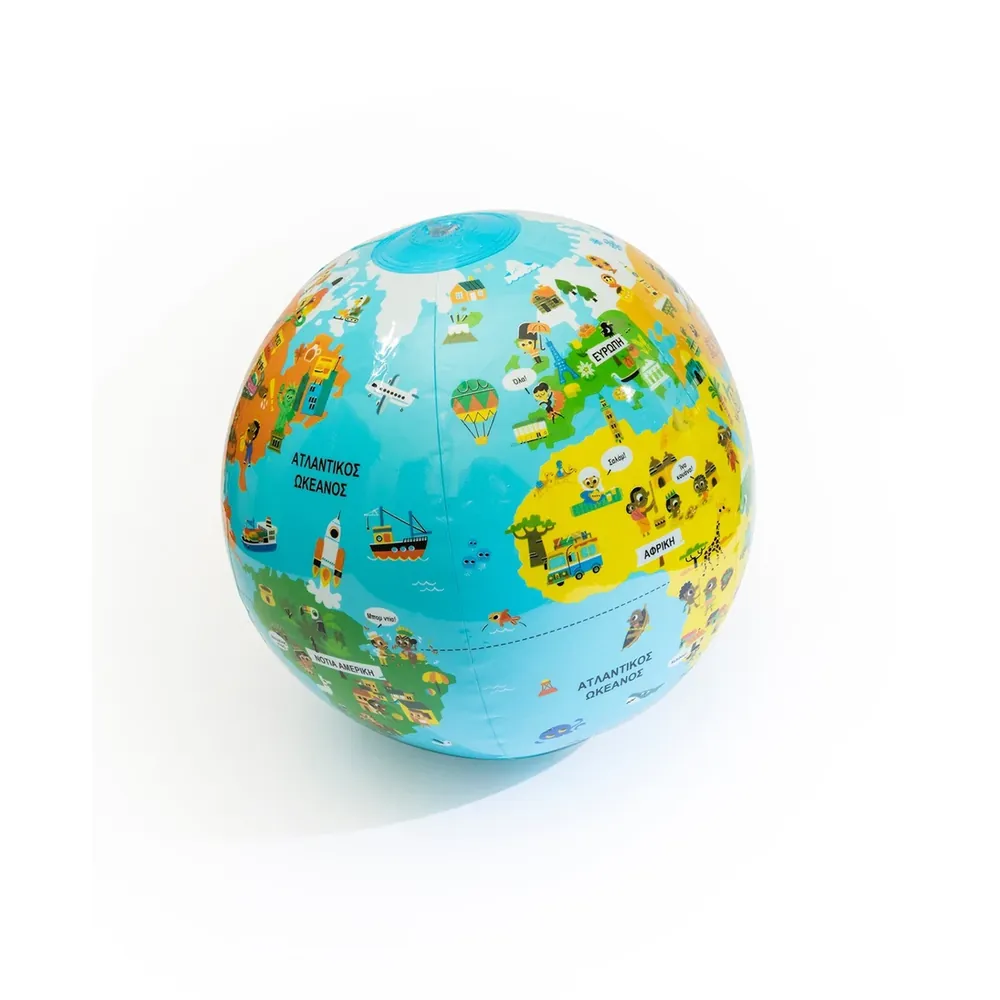 Περιέχει μία φουσκωτή υδρόγειο σφαίρα και φυλλάδιο με πληροφορίες και παιχνίδια!
