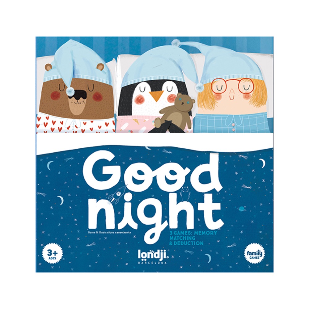 Το χαριτωμένο «Good Night» της Londji είναι ένα διασκεδαστικό παιχνίδι με τρεις διαφορετικούς τρόπους παιχνιδιού: ως παιχνίδι μνήμης, ως παιχνίδι αντιστοίχισης και ως παιχνίδι επαγωγής. Οι μικροί, νυσταγμένοι φίλοι μας είναι έτοιμοι για ύπνο. Ποιοι φοράνε τις ίδιες πιτζάμες; Ποιος κοιμάται σε ποιο σπίτι; Κάτω από ποια κρεβάτια κρύβονται τα τερατάκια; Ετοιμαστείτε για παιχνίδι και, καλή σας νύχτα!