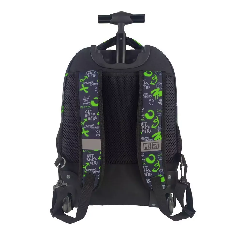- Εργονομική πλάτη με ενισχυμένους ιμάντες στο πίσω μέρος μετατρέπουν το σχολικό τρόλεϊ σε τσάντα πλάτης και εξασφαλίζουν το σταθερό κράτημα, τη σωστή κατανομή του βάρους και την προστασία της σπονδυλικής στήλης των μαθητών